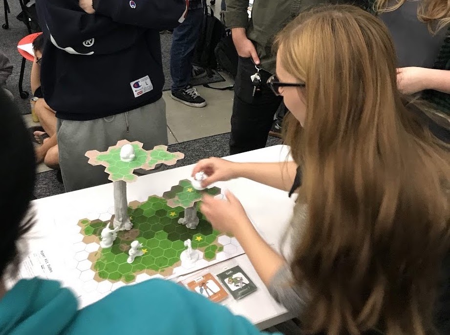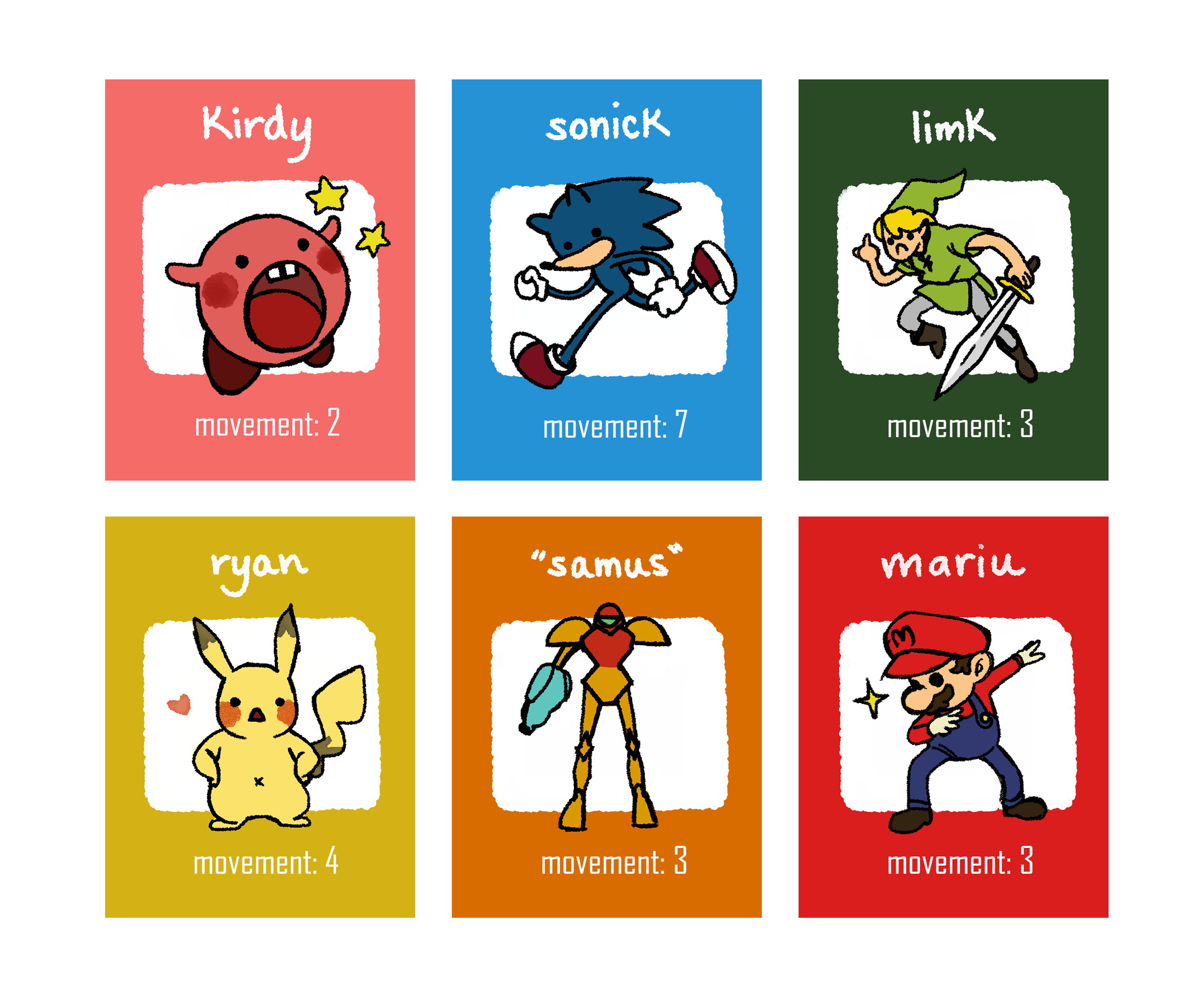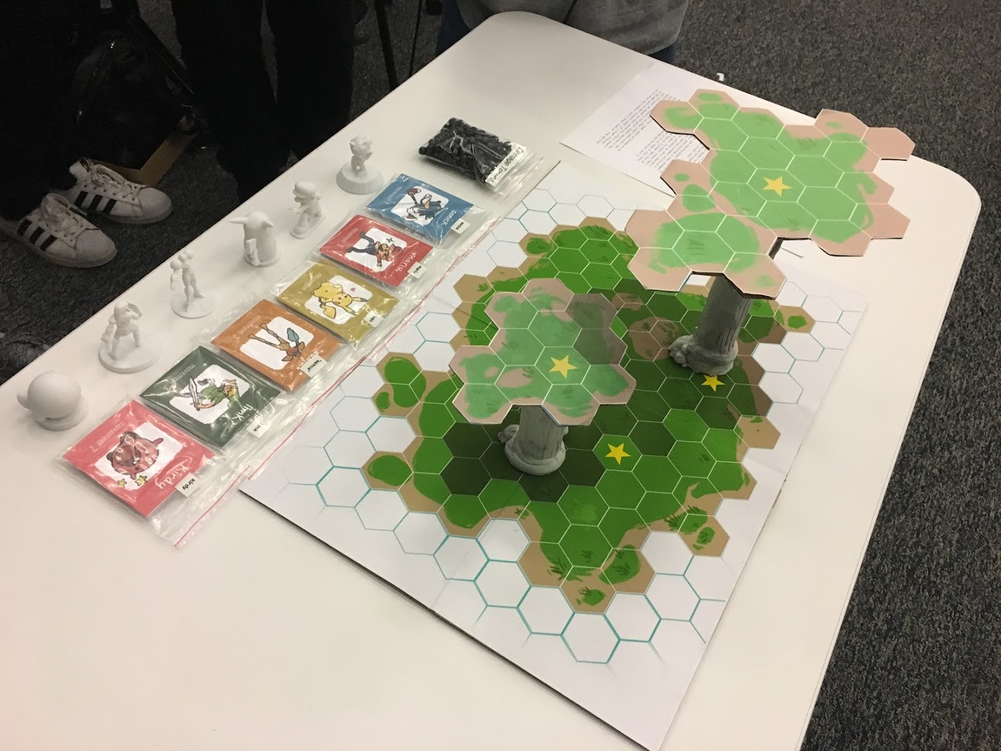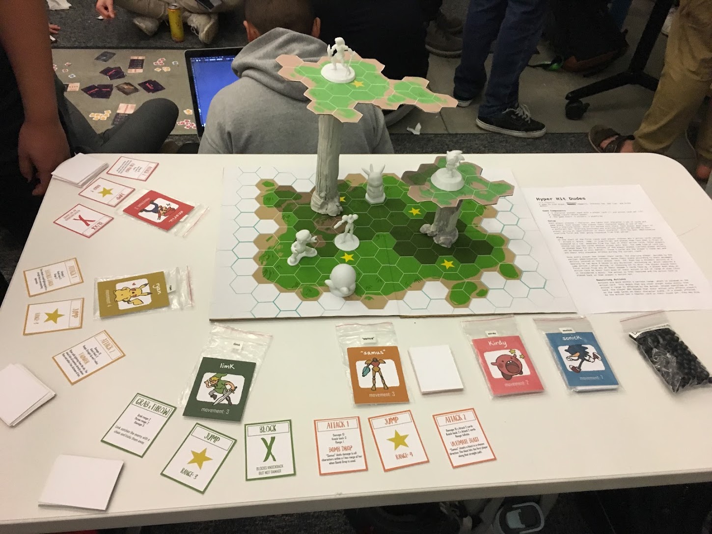Hyper Hit Dudes is a tabletop adaptation of Super Smash Bros that focuses on translating the game’s combat system to a multitier board game. The game's actions (attack, block, jump, etc.) are represented with cards that have special ranges where each action takes place on the game’s board. The range element of the game lead to the design of an isometric view, rather than the game's original frontal view, with a multitiered board made up of hexagons. This meant that players would need to be tactical in their maneuvering when dealing attacks, which all have different statistics depending on the player’s character, as well as when attempting to avoid damage.