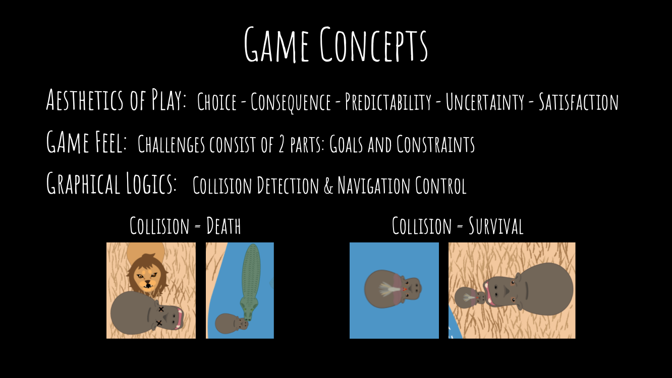 In this game, collision takes the “expansive” approach of the logic by meaning both death and survival. Running into a lion or crocodile will kill you, while overlapping with the bird or a parent brings safety. Because of this, the communicative goal of collision is shifted between life and death. This ties into the procedural rhetoric of the game. Having the collision mechanic be both translates into how life and death are connected in the circle of life, which is the metaphor represented by the behavior of the crocodiles spinning in circles. Death of one animal means the lasting life of another.