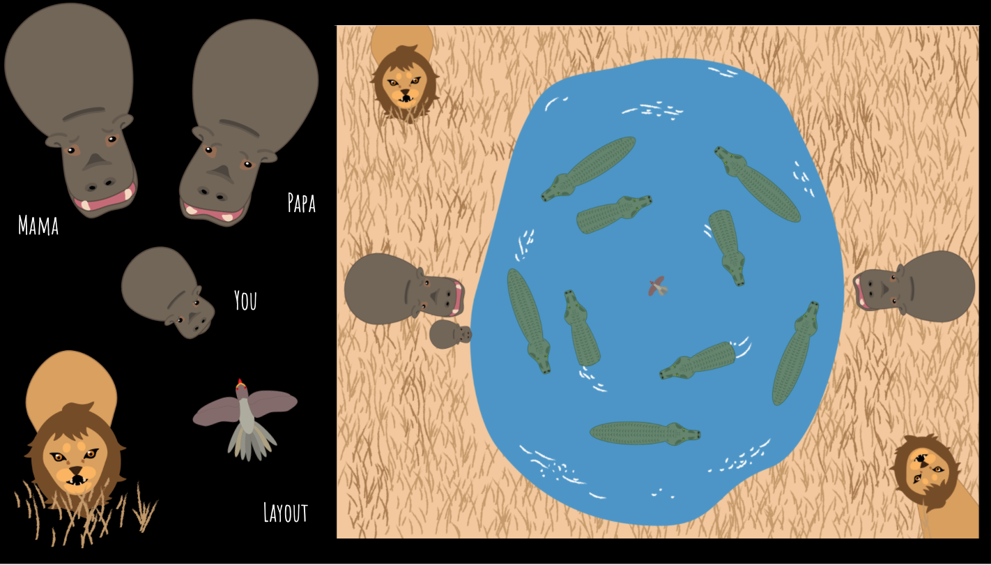 Opoffering is a puzzle game about a baby hippo who gets surrounded by crocodiles while trying to save a bird. Every movement made causes its parents to get closer and closer to getting eaten by the lions, so every move is sacrifice.