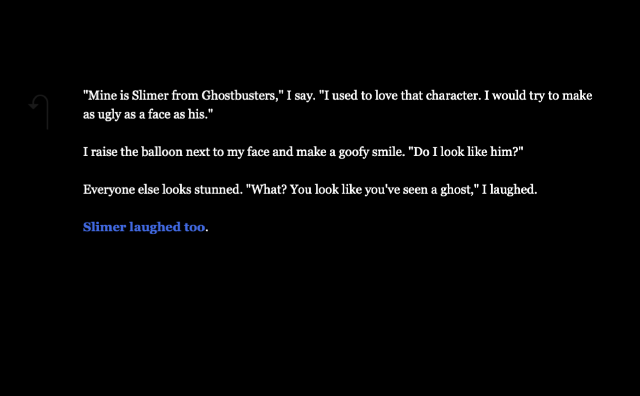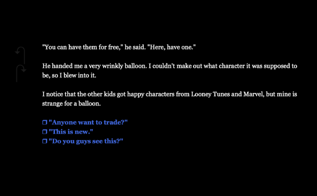 Out of Control is a Twine game that follows the narrative of a dream I had that breaks into different endings depending on the path you take. This game takes what used to be a linear story and shapes it into a branched structure to make it richer and more interesting to play when played more than once.